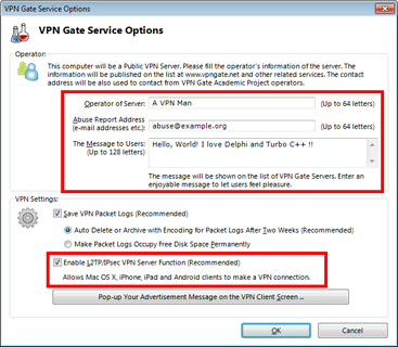 To enable L2TP/IPsec server function, check the "Enable L2TP/IPsec VPN Server Function" checkbox on the "VPN Gate Service Options" dialog.